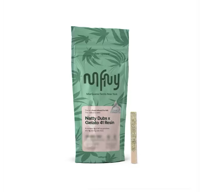 For our resin infused pre-rolls, we start with premium, hand-trimmed whole Gelato 41 flower then infuse it with our in-house made Natty Dubz live resin HTFSE (High Terpene Full Spectrum Extract from fresh frozen buds). This process creates a higher potency, flavorful product with the best of two cultivars: the enhanced, unmistakable sweet aroma of Gelato 41 balanced with the sweet candy flavor of Natty Dubz. Potent and high in THC, this product is a treat for experienced cannabis consumers. No shake, no trim. Just the very best of our craft cannabis, ready to enjoy. Exclusively single-sourced at MFNY in the Hudson Valley.