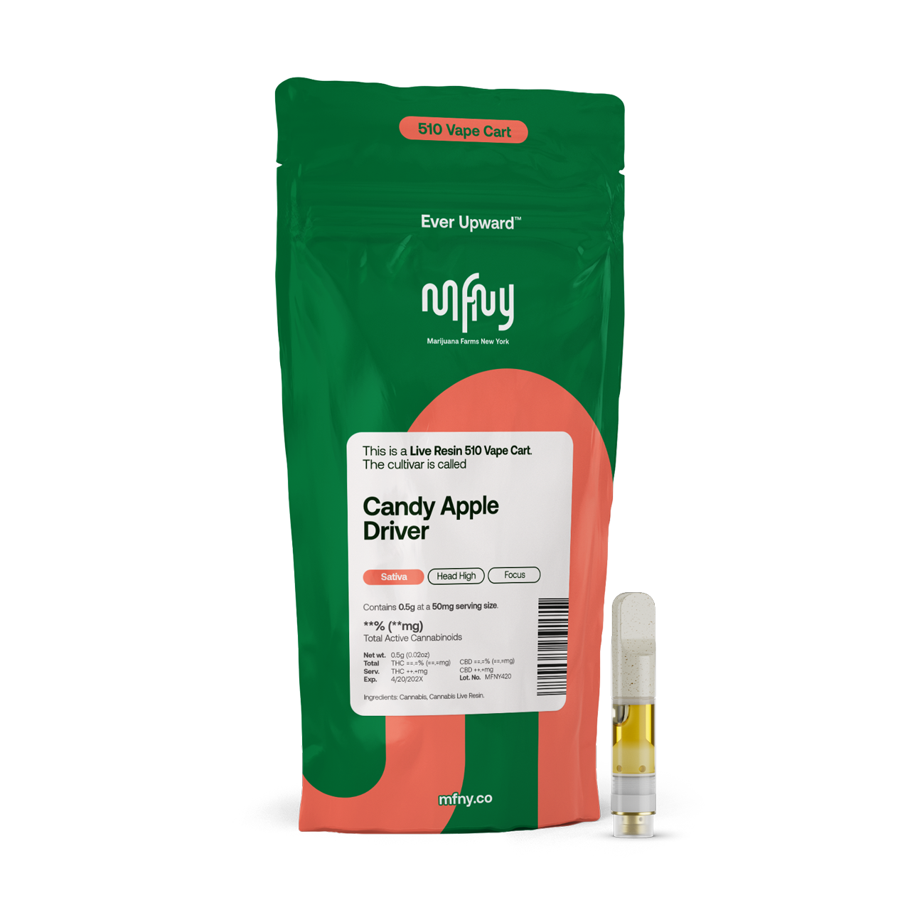 The MFNY live resin vape cart has a terpene-rich profile of our single-source, in-house produced Candy Apple Driver real live resin. We start with fresh-frozen flower buds, then use the hydrocarbon extraction method (plus years of experience and scientific precision) to deliver the purest plant extract. An extract that showcases the cultivar's naturally-produced, full-spectrum cannabinoids and remarkable natural terpenes. Candy Apple Driver is known for its candy sour apple with putrid undertones, which results in a focused head high. No distillates, added flavors, or alterations.